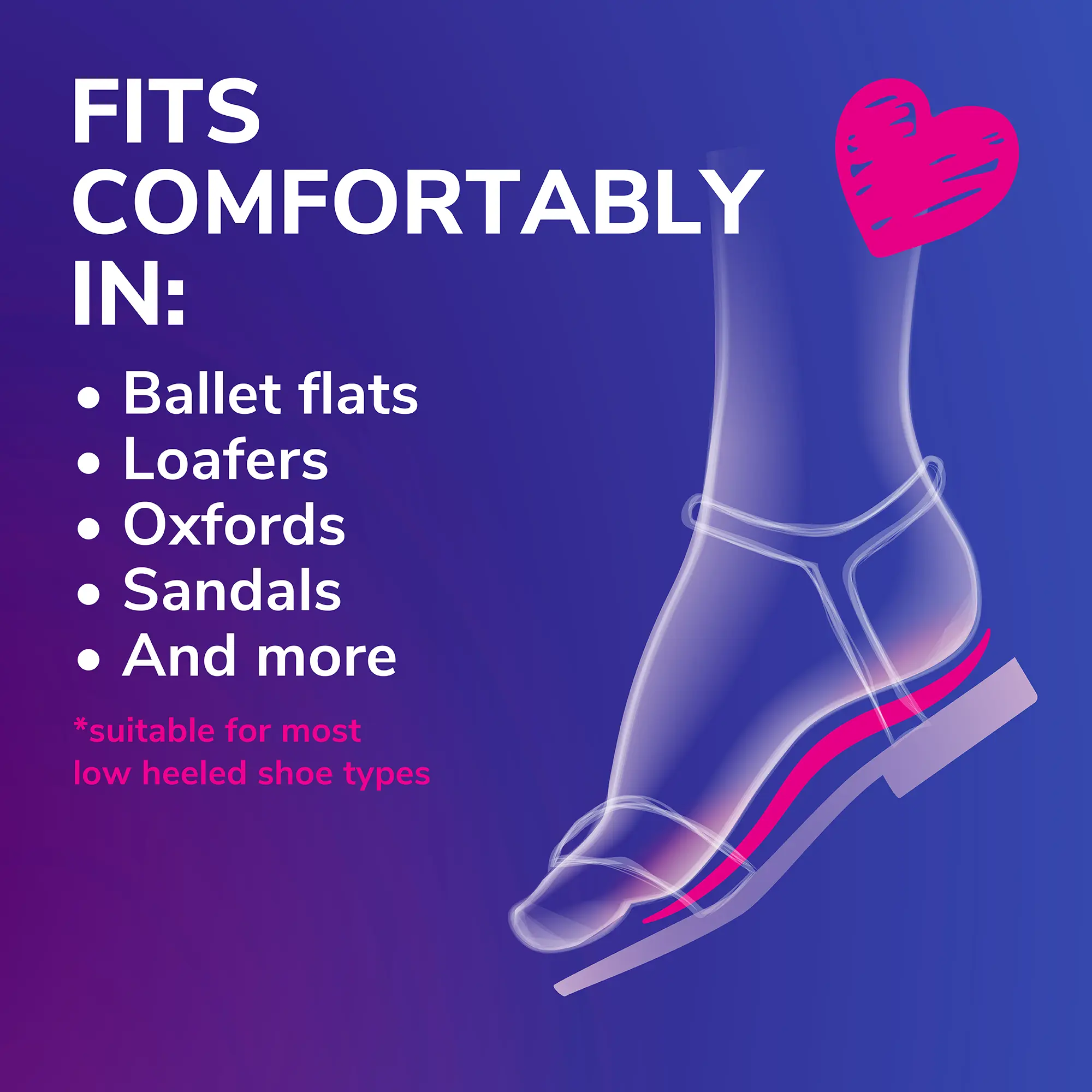 Dr. Scholl’s® Love Your Flats & Sandals 3/4 Length Insoles are specifically designed for women who experience foot discomfort when wearing their flats and sandals. The inserts are suitable for most low heeled shoe types – such as ballet flats, loafers, oxfords, mary janes, sandals, booties and more! Whether you’re heading to work, running errands, or just want to wear your favorite pair of shoes, you shouldn’t have to experience shoe discomfort. Don’t sacrifice feeling good for looking good, use these in your flats and sandals for all day comfort and protection.